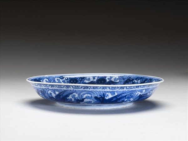 侈口窄唇,淺壁,矮圈足。盤內畫海獸十隻,外壁畫九隻,隙地滿畫波濤紋。外口沿下畫花形幾何圖案一周,花紋間加飾青線八道。底有青花書仿「宣德年製」雙方框款。