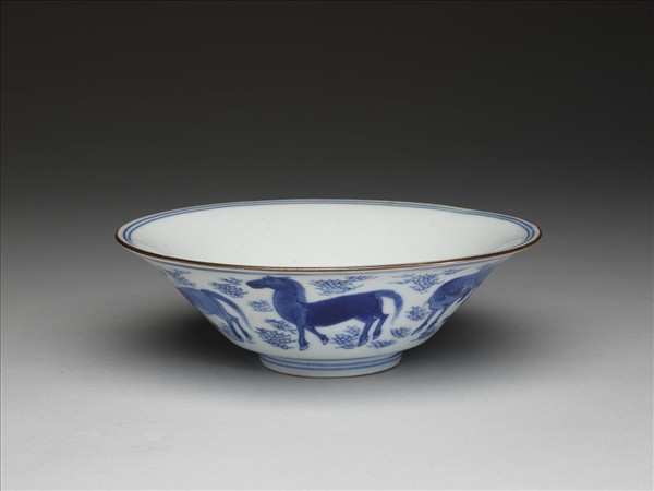 侈口,淺壁,矮圈足。口沿內外各飾青線二道,碗心畫馬一匹,外壁七匹,飾以山石野草。足圈飾青線三道,內壁純白樸素無紋飾。底有青花書「大明嘉靖年製」六字二行楷款,外加雙圈。