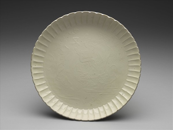 多瓣菊花形大盤,侈口,淺弧壁,平底無足,內壁有凸起之瓣稜形。胎骨稍厚,白釉微灰,口沿露白胎。盤內底印蓮塘垂柳,飾以鴛鴦雙鳧,隙地飾水波紋,內壁及外壁皆樸素無紋飾。