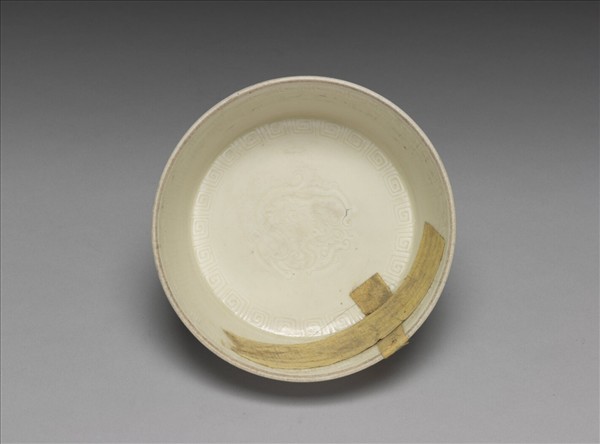 洗,圓口微侈,深壁,平底無足。口沿內外各劃回紋一道,內底心劃蟠龍一條,間飾雲紋,內底邊緣劃回紋一週。全器施白釉,釉色泛黃。採覆燒法,口緣露胎。