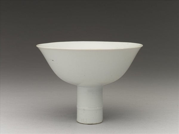 侈口,深壁,高圈足。盌內壁錐拱八寶花紋。足上飾有弦紋二道。甜白泑,盌壁胎薄,足圈稍厚。