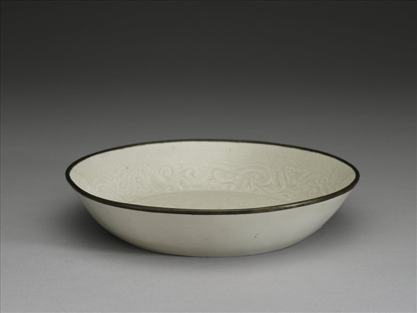 敞口盤,壁斜而淺,底寬平,底與壁轉折處一線微稜。全器滿釉,釉色牙白,僅口緣無釉,鑲銅稜釦。器裡印花為飾:口下回紋一周,並四條螭龍側身連貫繞行,姿態各異;底面以回紋為邊,兩條螭龍仰覆相向。印文清晰,刻模紋線流暢。
