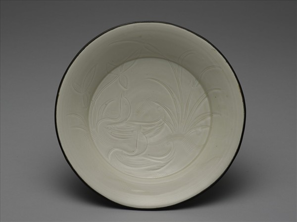 侈口、淺壁、平底,矮圈足。盤內劃蓮塘雙鳧,口邊淺劃弦紋一道。全器施白釉,口緣加鈐銅釦。