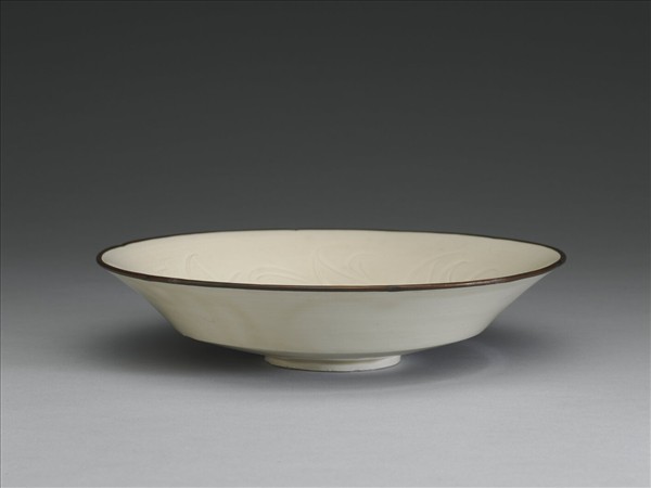 六瓣花口盤,撇口、折腰、小矮足。器裡折腰痕明顯,底寬平微凹下。通裡劃花為飾,斜出折枝帶葉荷花,三朵盛開的花朵搖曳,滿佔盤面。全器滿釉,僅口邊窄沿鑲銅釦。