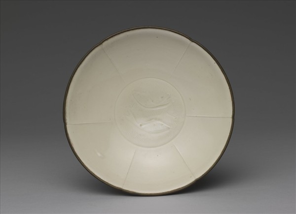 盤,六瓣葵花形,侈口,淺壁,平底,矮圈足。內壁以六凸棱劃分六瓣,內底心劃游魚兩尾及水紋。全器施白釉,釉色微黃。口鈐銅釦。