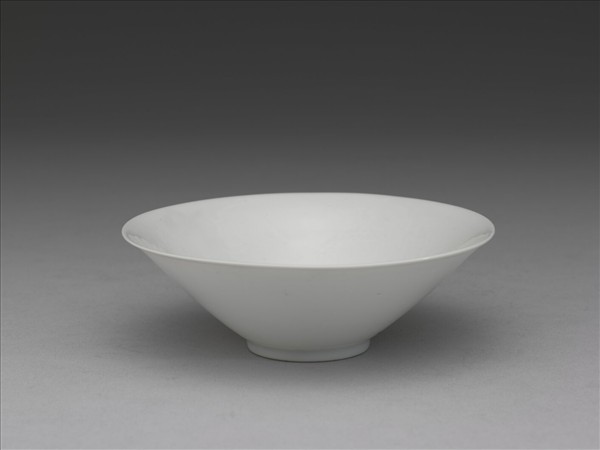碗,侈口窄唇,深壁,矮圈足。薄胎,能透光,自外壁可見內壁紋飾,俗稱半脫胎。內壁錐拱雙龍紋,內底心劃單圈「永樂年製」雙行篆體暗款。全器施白釉,釉色甜白。