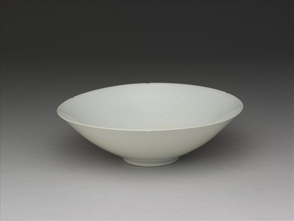 碗,六瓣葵花形,侈口,深壁,上豐下斂,平底,矮圈足。薄胎,能透光,自外壁可見內壁紋飾,俗稱半脫胎。內壁下半部錐拱纏枝番蓮花,上方加飾佛教八寶(八吉祥);內底心外緣飾一圈蓮瓣紋,中央錐拱「永樂年製」雙行篆體暗款。足沿露胎,餘器施白釉,釉色甜白。故瓷14514-14517同裝於一木匣中。