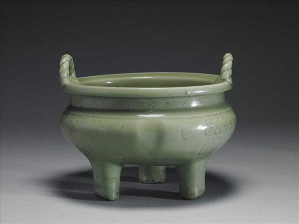 鼎式爐,盤口、束頸、寬圓肩、扁斂腹、平底、三扁圓柱狀足;口部立二半圓形繩索紋耳,繩索紋細緻。外壁以劃花為飾,頸作回紋,肩飾短花瓣,腹以凹痕將壁分三等分,各劃一組纏枝花卉,線條流暢。釉色較灰淡,三足端及外底中央無釉,色朱;器裡色淺,遺三塊窯泥。
