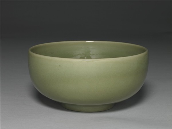 直口大碗,廣口、深腹、圈足,垂直的壁面至下腹處始收束,一名「墩子碗」。全器光素無紋,釉色瑩亮碧綠,外壁釉汁流動。足裡環形無釉墊燒區,色朱紅,並遺有粗澀的白色實際墊燒痕。
