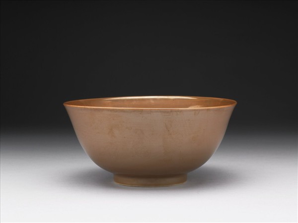 侈口,深弧壁,淺圈足。全器除底心外皆施紫金釉,色暗橙黃帶金屬光,勻亮典雅,平素無紋飾。器底施白釉有青花書「大明嘉靖年製」二行六字楷款,外加雙圈。紫金釉又名醬釉、柿色釉,係以鐵為著色劑的高溫釉。