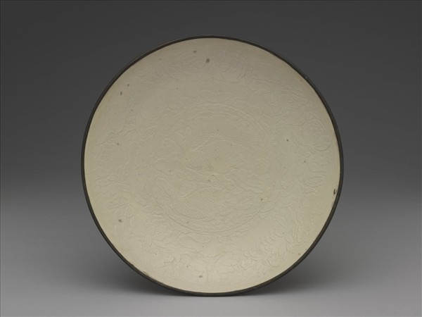 大盤,弧形淺壁,圈足,外壁釉汁粗率,足端滿釉,口緣銅釦,口下一道陰弦紋。器裡釉色勻,有雜斑,滿飾模印紋飾。盤心作雙魚游於荷塘,周壁為多組連枝並蒂荷花綴以荇蓼水草。花多豐碩,雙鯉魚亦豐肥,紋飾密佈無空隙。盤心與盤壁以索狀框飾為界。這樣多股繩線交纏為索的邊線,在定窯瓷器中並不常有,然在唐代金銀器錘鍱押印的邊框中亦能見及。