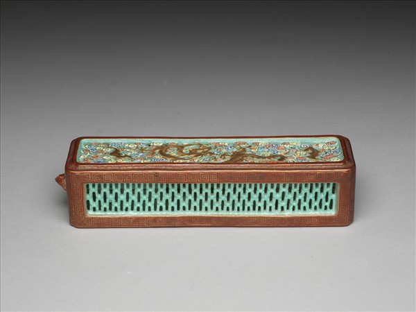 長方形,器內中空,一端有塞子。平底無足。塞子的鈕作蝙蝠抱桃形,平面頂蓋及長管。蓋口為子母卡榫狀。器面鏤空雲龍紋一條,加飾雙蝠,龍、蝠描金,雲施彩色。器壁三面鏤空長方格紋,面施湖綠釉,器身周邊施珊瑚紅釉,釉上以描金繪回紋,卷草紋及菱形錦紋。器底珊瑚紅釉,有支釘痕十一枚,痕跡上塗金。器內有一小長方塊,用來架高線香,以便易燃。其作用如同筷架。