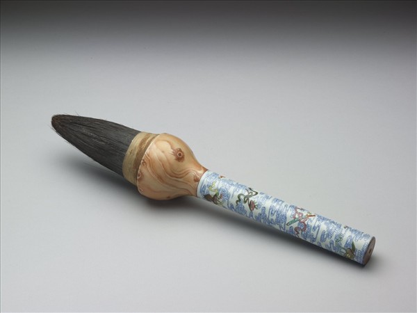 瓷質斗筆管,直管部分以粉彩繪雲蝠紋及八仙手執法物(俗稱「暗八仙」);筆斗部分繪如瑪瑙纏絲紋;筆管上端彩繪花瓣。毫質粗硬如鬃,上端繫以絲索。