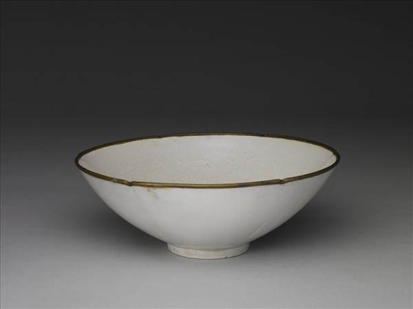 敞口深碗,弧形壁,圈足,口作六瓣花式;胎骨輕薄,口緣無釉,鈐銅口;外壁光素,略勒六道短凹痕,使有花稜之意。器裡由壁至底,滿印荷塘游魚紋,蓮荷花葉、荇草、浮萍間,水波蕩漾,四對魚兒游於其間;紋線細密清晰。