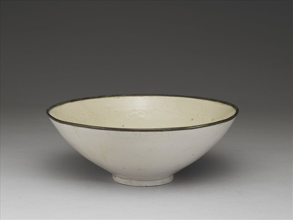 敞口、弧形深壁碗、圈足。全器施牙白釉,僅口緣無釉鑲銅稜釦,外壁釉汁流淌。器裡印花為飾:口以下卷草紋為邊飾,細陽線將內壁分六等分,分別飾蓮、牡丹、月季、山茶等折枝四季花卉;底心則印一叢菊花。