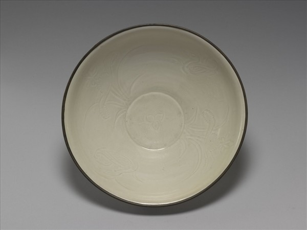 侈口,口沿略捲邊,深壁,圓底矮圈足,帶銅釦。器內壁劃刻蓮花及水波紋,間飾鳧鵝一對,器外壁樸素無紋飾。全器施白釉,口沿一週及器外底部分、足底緣未上釉,釉色微黃,器外壁微見釉汁流淌的「淚痕」。定窯窯址位在河北省曲陽縣澗磁村、燕山村一帶,窯場廣佈,是宋元時期北方最著名盛燒的白瓷窯場。