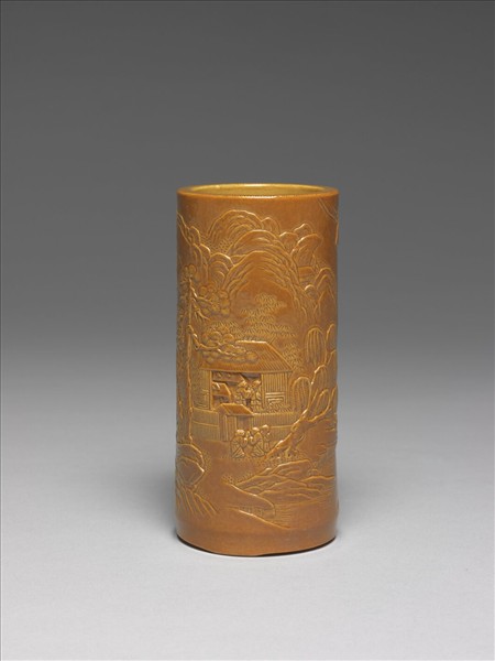 紫金釉雕刻山水筆筒