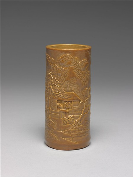 紫金釉雕刻山水筆筒