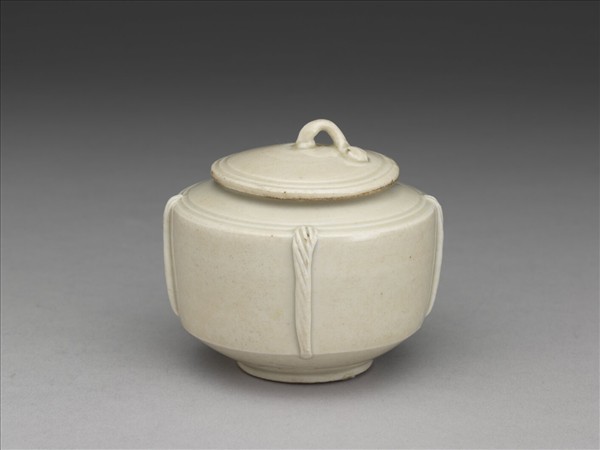 蓋罐,直口、斜肩、直壁、下腹斜折、圈足。蓋具子口,頂飾瓜蒂狀鈕,器身貼飾四縱向泥條,泥條上加刻斜繩紋。蓋面、肩部各以雙弦紋劃刻為飾。蓋裡無釉露白胎,口緣、足端無釉。貼直稜泥條的裝飾習慣,或與金屬器裝飾相關,常見於十世紀的出土品,而本器與洛陽後梁高繼蟾墓(909)的蓋罐最相近,亦堆貼直泥條為飾、瓜蒂狀蓋鈕。