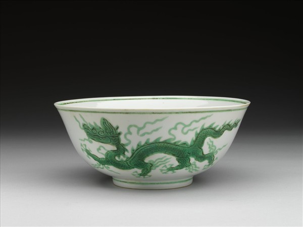 侈口窄唇,深壁,矮圈足。碗心與外壁刻畫雲龍三條,外壁隙地淺劃波濤紋。內壁純白,樸素無紋飾,薄胎白釉,龍紋加填綠彩。底有青花書「大明弘治年製」六字二行楷款,外加雙圈。