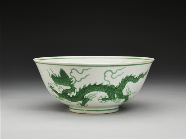 侈口窄唇,深壁,矮圈足。碗心與外壁刻畫雲龍三條,外壁隙地淺劃波濤紋。內壁純白,樸素無紋飾,薄胎白釉,龍紋加填綠彩。底有青花書「大明弘治年製」六字二行楷款,外加雙圈。