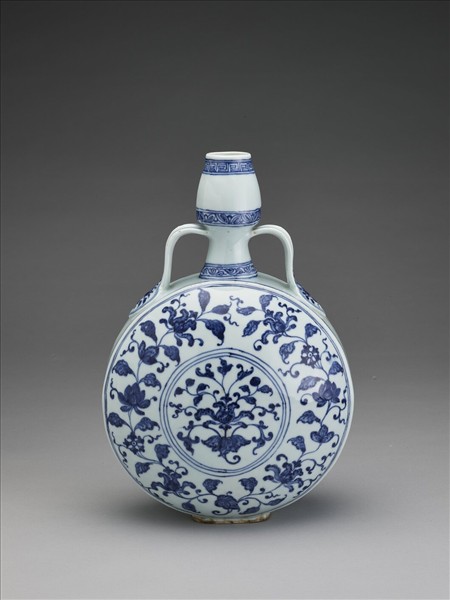 仿葫蘆形,腹部扁圓,橢圓圈足,頸飾兩弓形耳。上截畫回紋、花瓣及卷草紋各一周。腹部兩面各畫番蓮花一周,中心畫青線三道,番蓮花一枝。