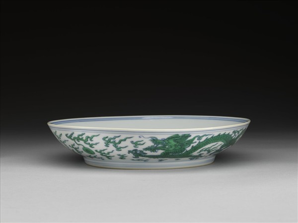 敞口,淺壁弧形,矮圈足。盤心與外壁分畫趕珠龍三條,隙地滿飾雲紋。雲、龍均用青花鉤勒,加填綠彩,口足分飾青線九道。內壁純白無紋飾。底有青花書「大清雍正年製」六字二行楷款,外加雙圈。