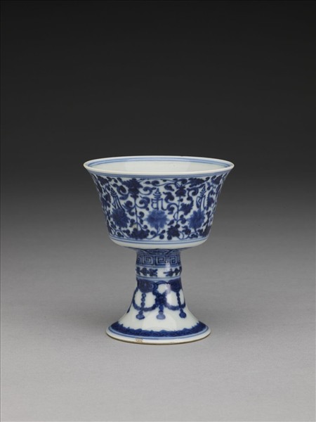 撇口,深弧壁,高圈足。外壁畫纏枝番蓮及梵文,內壁底心畫番蓮一朵,底邊為蓮瓣紋。高足飾以回紋、金剛杵、如意雲紋等,以青線分隔。內外口沿、底邊各加飾青線二道。底有青花書「大清乾隆年製」六字單行篆款。