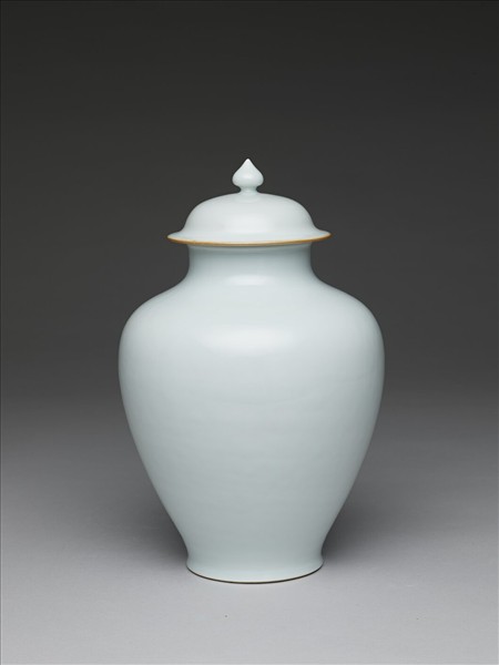 仿陶器甒形,直口,短頸,腹上豐下歛,矮圈足。笠形蓋,桃形紐。白釉泛青,樸素無紋飾,底足露胎。