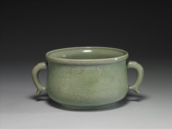 仿銅簋式香爐,器身小盤口直稜,垂直深壁,近底處微圓鼓;圈足。腹兩側各作半環形耳,若獸形,並斜出尾尖。全器青綠釉,釉面多深淺開片,足端平削滿釉,內外底中央均大片無釉,色深褐。簋式爐造型在南宋官窯系統中常見,明清官窯亦夥。而此器軟弱細扁的耳型,反與嘉靖吳經墓哥窯型簋式爐,或芝加哥藏崇禎款黃釉簋式爐相近。