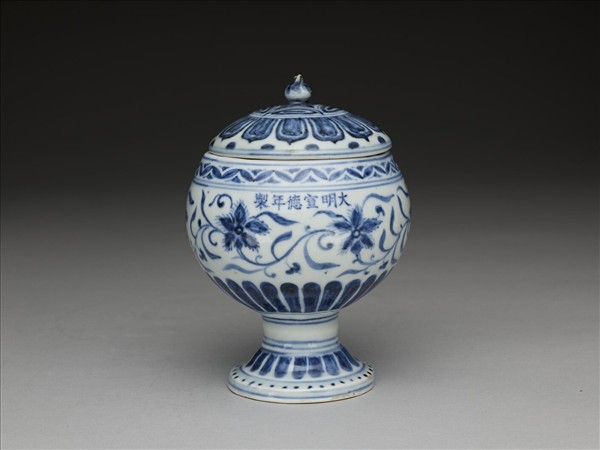 仿銅器豆形,帶尖頂蓋。蓋上畫蓮瓣紋。腹部畫轉枝五瓣花一周,上下加飾花瓣紋。足畫花瓣紋及星點。器內底心畫花卉一枝,加飾雙線。口沿花瓣紋下有青花書「大明宣德年製」六字單行楷款。