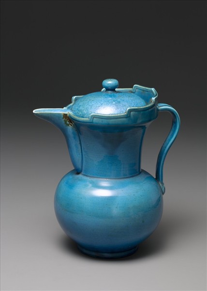 口似僧帽形,尖流口、扁鋬把,長頸,碩腹,矮圈足。帶圓頂,長舌蓋。胎骨上薄下厚,通體滿施綠釉,面佈細密冷紋。底刻有「真藏」二字,外罩綠釉。