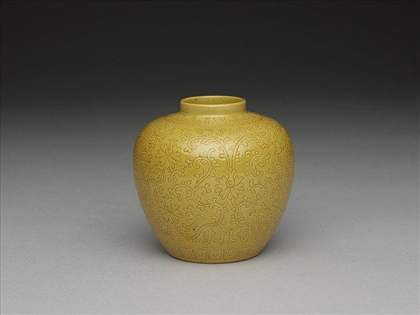 直口,短頸,豐肩,斂腹,矮圈足。肩上與底邊,各刻蓮瓣紋一周,腹部劃纏枝番蓮。胎骨較薄,內外滿施嬌黃釉,器底純白。