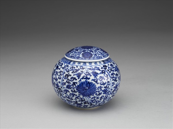 歛口,圓肩,球形腹,矮圈足。肩上與底邊,各畫卷草紋一周,腹部及蓋畫纏枝花卉共九朵,隙地滿繪轉枝葉。口沿下有青花書「大明宣德年製」六字單行楷款。
