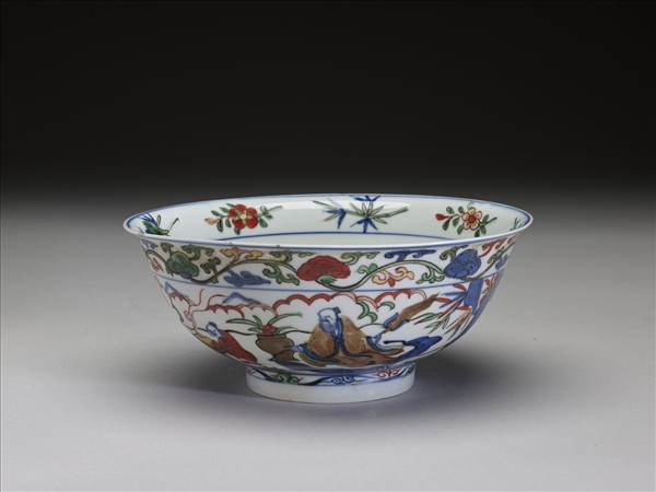 侈口窄唇,深壁,矮圈足。口唇上彩畫松、竹、梅八枝,間飾青線二道,碗心畫彩龍一條,邊飾雙青線。外壁彩畫仙人獻壽圖,口沿畫轉枝靈芝八朵,足飾卷草紋,口足加飾青線二道。底有青花書「大明萬曆年製」六字二行楷款,外加雙圈。