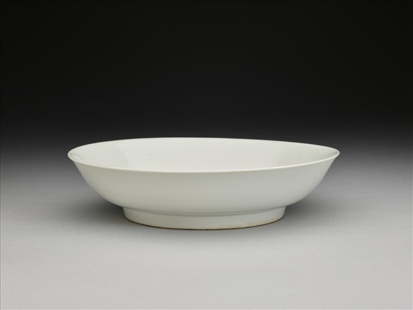 侈口,淺壁,矮圈足。胎質較薄,釉色甜白,樸素無紋飾。底有青花書「大明弘治年製」六字二行楷款,外加雙圈。