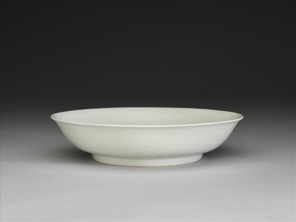 侈口,淺壁,矮圈足。胎質較薄,釉色甜白,樸素無紋飾。底有青花書「大明弘治年製」六字二行楷款,外加雙圈。