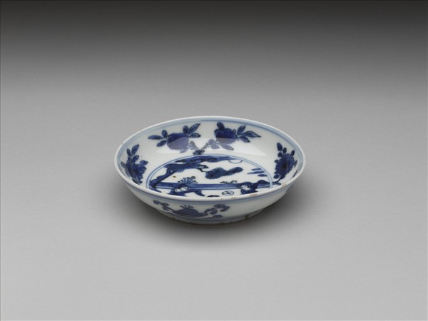 敞口,淺壁,矮圈足。盤心繪三兒童蹴鞠圖,內壁飾四季花卉,外壁畫靈芝四株。底有青花書「大明成化年製」六字二行楷款,外加雙圈。