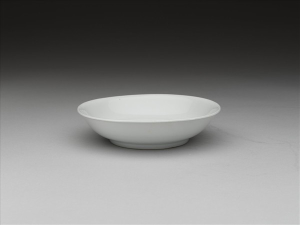 侈口,淺壁弧形,矮圈足。器內外壁滿施白釉,盤底純白,樸素無紋飾。底有青花書「大明成化年製」六字二行楷款,外加雙圈。