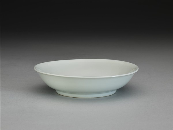 侈口,淺壁弧形,矮圈足。器內外壁滿施白釉,盤底純白,樸素無紋飾。底有青花書「大明成化年製」六字二行楷款,外加雙圈。