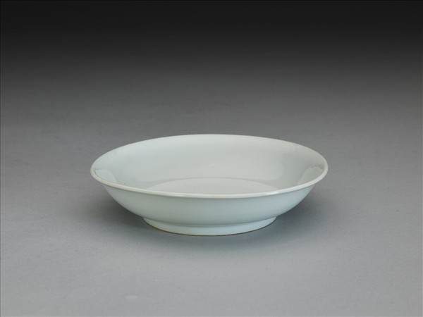 侈口,淺壁弧形,矮圈足。器內外壁滿施白釉,盤底純白,樸素無紋飾。底有青花書「大明成化年製」六字二行楷款,外加雙圈。