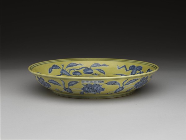 侈口窄唇,淺壁,矮圈足。內壁畫石榴、葡萄等果實四折枝,盤心畫玉蘭花一枝。外面畫轉枝牡丹花七朵。原為白地青花,面加黃釉一層,盤底全部露胎。外口沿下有青花書「大明成化年製」六字橫行楷款。