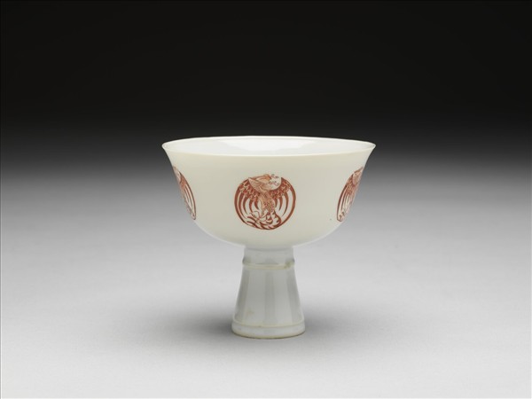 侈口窄唇,深壁,高圈足。胎骨極薄,泑色甜白。器底心與外壁,分畫描紅團鳳六隻。足圈飾弦紋二道凸起。
