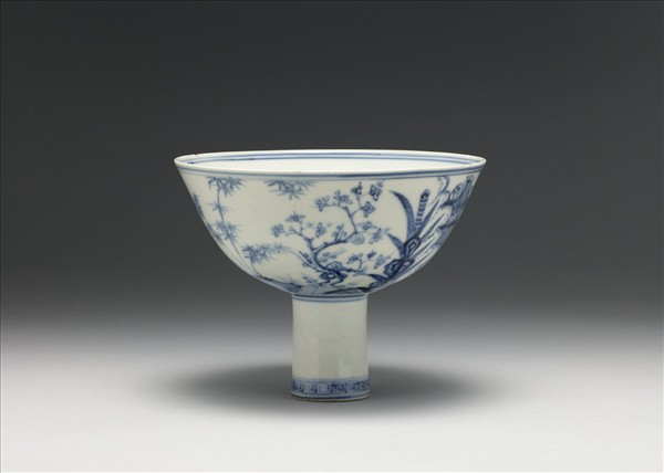 侈口,深壁,高圈足。壁胎薄,足圈稍厚。碗心畫坡石及松竹梅三友,內壁純白無紋飾。外壁畫山水樓閣,飾以松竹梅及芭蕉等,足圈畫回紋一周。