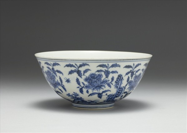 侈口窄唇,深壁,矮圈足。薄胎白釉,外壁青花畫牡丹花六株飾以坡石、草花蜂蝶。內壁純白,樸素無紋飾。