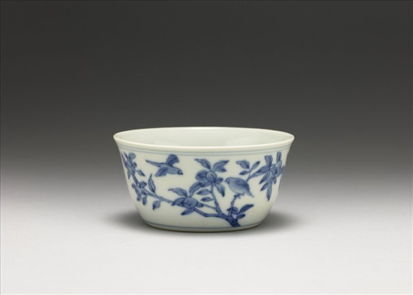 侈口窄唇,深壁,矮圈足。薄胎白釉。杯心青花書梵文五字,加飾四如意雲及雙圈,內壁純白無紋飾。外壁畫花果、鳥紋,口足分飾青線三道。器底全部露白胎。