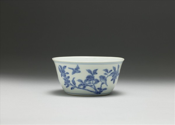 侈口窄唇,深壁,矮圈足。薄胎白釉。杯心青花書梵文五字,加飾四如意雲及雙圈,內壁純白無紋飾。外壁畫花果、鳥紋,口足分飾青線三道。器底全部露白胎。