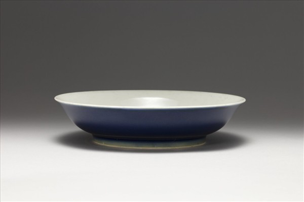 侈口窄唇,淺壁,矮圈足。胎骨稍厚,外面深青色釉,內面及底純白,樸素無紋飾。