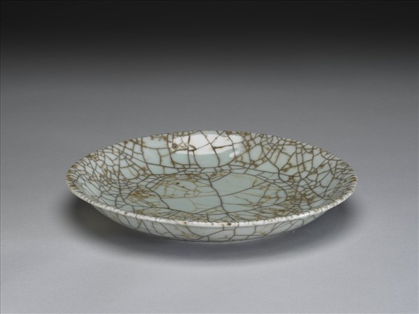 侈口窄唇,淺壁,矮圈足。厚胎骨,通體施淺粉青色釉,滿佈黑黃色紋片。