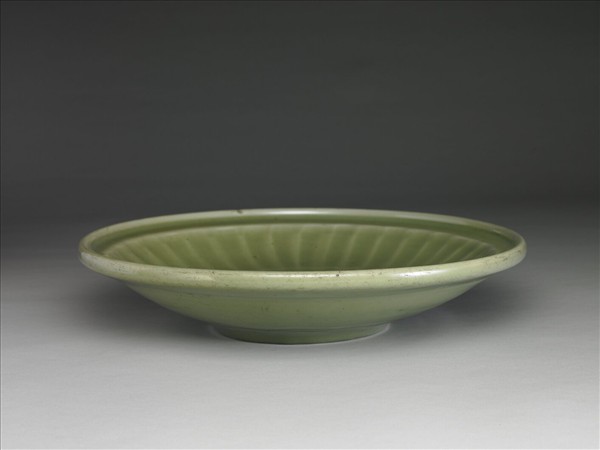 折沿盤,沿斜上折,沿邊細唇稜高起。敞口、弧形壁、圈足。外壁光素,近底凸弦紋一道。內壁直線菊瓣飾,底部周劃一道弦紋線,中央略高起,有印花牡丹團花一組,印紋清晰。裹足滿釉,足內底部朱色環形無釉墊燒區,環緣散亂。